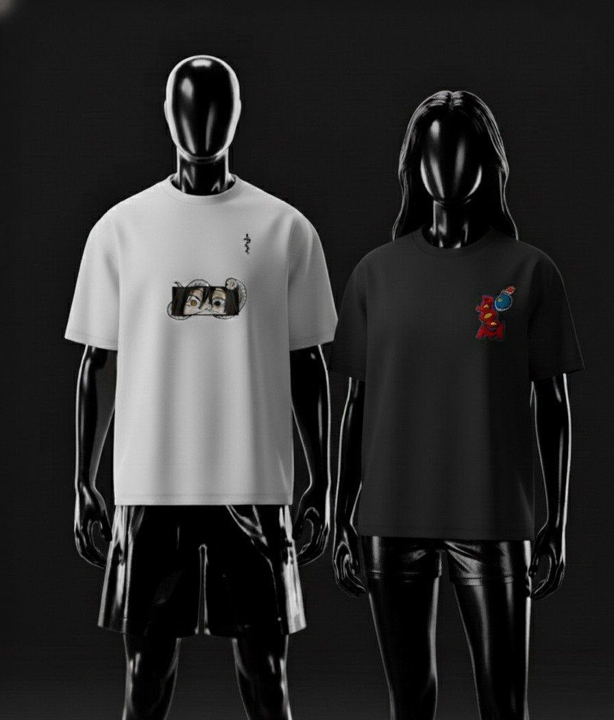 Anime Eyes Embroidery Oversized T-Shirt (Black & White, Unisex Streetwear)